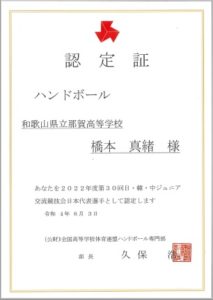の選手選考基準で審査を行い、那賀高校3年生の橋本真緒さんは、みごとに代表選手14名の中に選出され、日・韓・中ジュニア交流競技会の日本代表選手に認定されました。