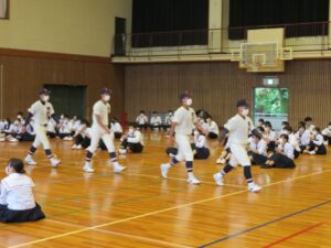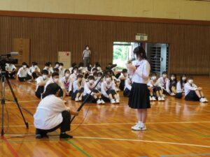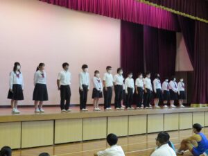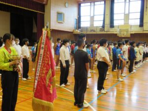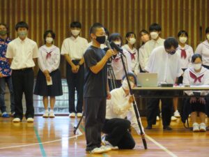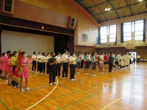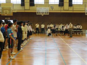 令和4年7月4日(月)1学期末考査終了後、本校の体育館において、壮行会/生徒会引継ぎ式/語学アシスタント紹介を開催しました。今回も新型コロナウイルス感染症対策として、代表生徒のみが体育館に集合し、他の生徒は教室からのリモート参加で行いました。