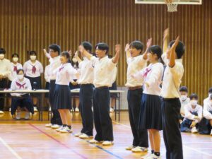 旧役員の紹介の後、旧会長の阪部さんから、「感染症の影響を受ける中だからこそ、自分たちにできることは何なのかについて、皆で考え取り組めたことが良い経験となりました。」と、生徒会での活動を振り返るとともに、次期生徒会への激励と生徒の皆さんや先生方への感謝の気持ちを話しました。その後、新役員の紹介と新会長の景山さんが代表して挨拶しました。