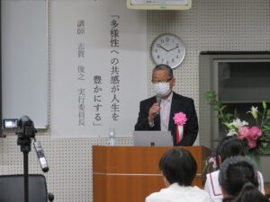 「多様性への共感が人生を豊かにする」という演題で、生徒たちが今すべきことは何かという観点で、パワーポイントを活用し、ご自身の経験を含めてわかりやすくご講演いただきました。また、講演後の生徒からの質問にも丁寧に答えていただき、生徒・教員共々、たいへん貴重な時間を過ごすことができました。