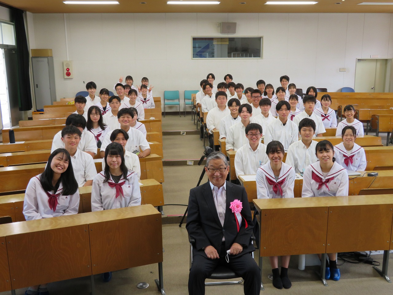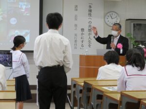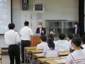 本日は、熱中症対策や感染症対策を考慮して、視聴覚教室にクラスを代表する生徒を集めて志賀様から講義していただき、他の生徒は教室からリモートで視聴するといった形で催しました。