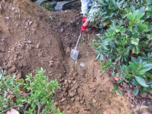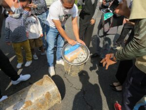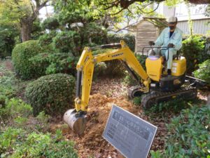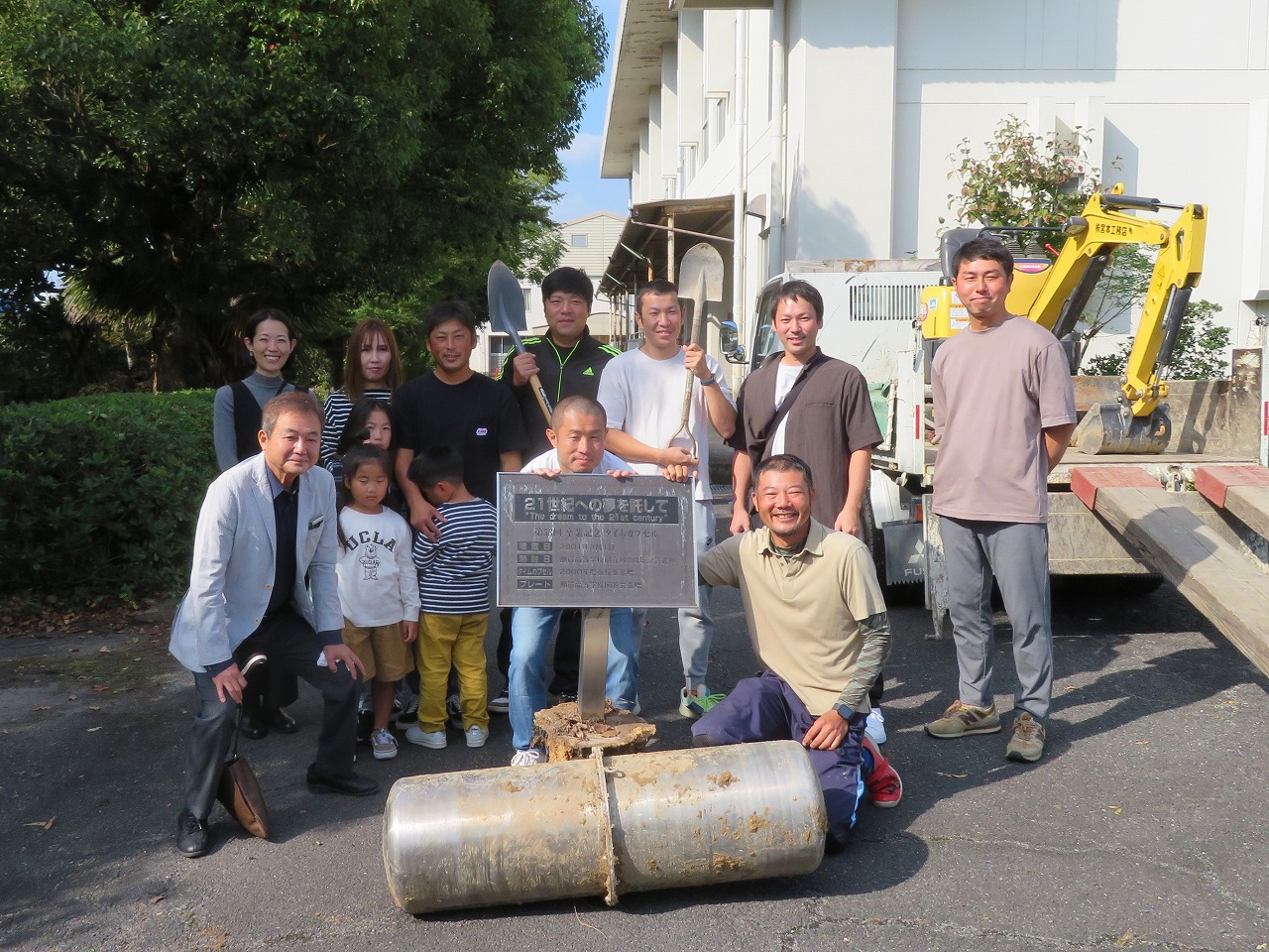 掘り起こしの作業は、国際交流会の宮本会長によりユンボーで行われました。場所が特定しにくかったこともあり30分以上苦戦しながら作業を進めました。そして、21年余の年月を経て、たくさんの思い出が詰まっているステンレス製のタイムカプセルが土底から顔を出したとき、卒業生たちの歓声が体育館前に響き渡りました。本当に素敵な瞬間でした。