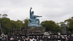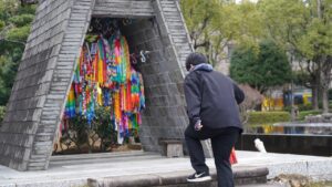平和学習では、平和公園の平和祈念像の前に整列し、修学旅行委員長の磯俣圭さん(2B)が代表して、2年生全員で心を込めて折った千羽鶴を「折鶴の塔」に奉納しました。その後、旅行団全員で黙祷し平和への祈りを捧げました。その後、原爆資料館を訪れ戦争の惨劇を学びました。