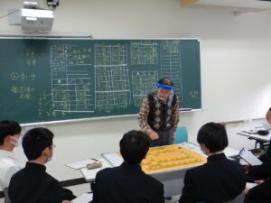 2月2日(木)、昨年11月に近畿総合文化祭で審判長を務められた伊達先生をお招きし、指導対局をしていただきました。伊達先生は、和歌山県のアマチュアの大会運営や棋道指導員として広く活躍されている方です。