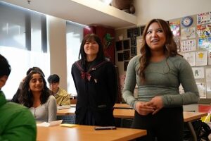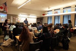 日本語クラスの授業を担当されている段下先生は、本校国際科の卒業生。イサクア・ハイスクールで10年以上教鞭をとられるとともに、大学でも日本語クラスを受け持つ名物先生です。授業を見学させてもらって驚いたのはそのスピード感。分刻みで次から次へと課題が変化し、生徒たちも忙しく立ち回る。集中して取り組んでいるとあっという間に1時間の授業が終わっている。そんな刺激的な時間を過ごしています。