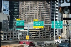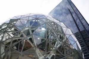研修6日目の今日は、シアトルのダウンタウンへ行ってきました。イサクアからシアトル市内まではバスで半時間程。大きなワシントン湖を、世界的にも珍しい浮橋を渡っていきます。浮橋は、湖の深さが200フィート(約61メートル)もあり、さらに湖底が不安定なシルト質であるため、橋脚を建設できないことによるそうです。走行していても浮いている感覚はもちろん全くありませんが、湖面がとても近く感じました。