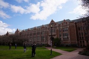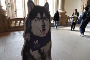 向かった先はワシントン大学。レッド・スクエアと呼ばれる広場に面し、荘厳な雰囲気をかもしだすスザロ図書館は全米で最もクールな大学図書館に選ばれたこともあります。映画 『ハリー・ポッター』 に登場するホグワーツ魔法魔術学校を彷彿とさせることでも知られています。大学のマスコットはハスキー犬。可愛いぬいぐるみを買い求めた生徒が多くいました。