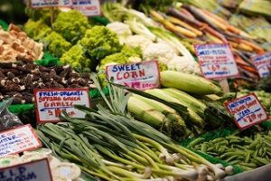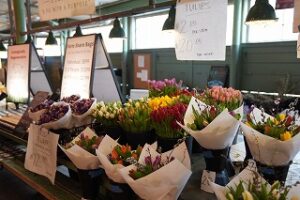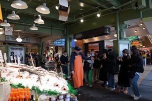 次に向かったのは、現存するマーケットでは全米で最も歴史の長い、パイク・プレース・マーケット。ショップやレストラン、カフェが詰まったおもちゃ箱のようなマーケットにはたくさんの観光客が詰めかけていました。「フィッシュ哲学」で知られる魚屋をはじめ、色とりどりの新鮮な野菜や果物、花などが所狭しと並べられています。ワシントン州は全米でも有数の農産物の産地で、いろいろな野菜や果物を見ることができます。
