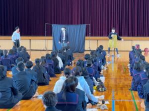 2限目は、吉本興業のラビットラとフリーのいけ団地の 3人の演者によるコント『将来決めんとジャッジメント』で、フリーターと正社員の違いという社会的な内容でしたが、コミカルなストーリーで分かりやすく関心を持って聞くことができたようです。