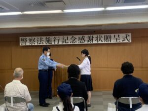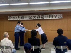 令和5年7月3日16:30から岩出警察署において、感謝状贈呈式が行われました。通常の警察業務の関わりに対して、貢献されている個人や団体に感謝状が贈られました。本校からは、放送部と華道部に贈呈されました。放送部は、岩出警察署高校生広報員(FLORIAサポーター)として、職員の方とともに、啓発広報活動を年間通じて行っています。また、華道部は、岩出警察署内に四季折々の花を生けて、見る人の心を和ませています。今後もこうした活動を続けていきたいと思います。