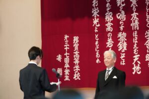 もう一つ、那高の伝統としてお願いしたいことは、学校行事などさまざまな活動をみんなが一致団結、いわゆる「チーム那高」として、精一杯やり遂げるということです。那高祭と呼ばれる文化祭・体育祭、それから球技大会、遠足や修学旅行・外国研修など那高には様々な行事や活動があります。それらをするときも、那高生はいつも全力投球です。また、本校には、県内で二校しかない国際科があります。そのおかげで、外国の高校生がよく研修に来てくれます。異文化とじかに接する、国際交流の絶好の機会と言えます。校内での交流だけではなく、国際科・普通科を問わず、ホストファミリーとして、外国の仲間と生活を共にして欲しいと思います。日本に居ながら、外国留学と同様の貴重な体験をすることができます。家族で相談して、事情が許されるなら、ぜひ、チャレンジしてください。那高での学校生活に、熱い思いをもって挑戦していってください。そこには失敗もあるでしょう。けれども、くじけることはないのです。なぜなら、失敗は単なる失敗ではなく、次の未来をつむぎ出す土台となるからです。時には、悩みを抱えたり、辛くなったりすることもあると思います。