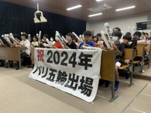 令和6年7月29日(月)16時から本校の視聴覚教室で「パリ2024オリンピック男子ハンドボール日本代表ライブビューイング」を開催しました。本校出身の吉田守一選手(平成31年3月卒業生)が男子ハンドボール日本代表に選出され、地元和歌山から応援をする目的です。