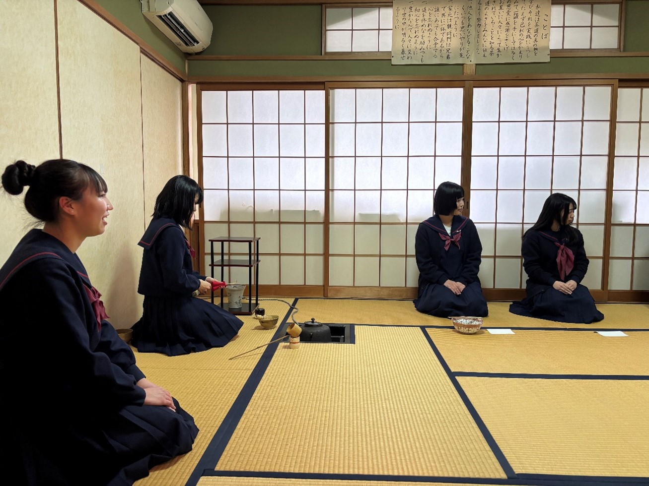 茶道部は毎週水曜日に活動をしています。主な活動としては、文化祭や国際交流会のための茶道の基本的な所作の稽古です。文化祭では生徒だけではなく、一般のお客様や先生方にもお茶とお菓子を振る舞っています。また、国際交流会では海外からのお客様に茶道を体験していただきます。和菓子とお茶を差し上げるだけでなく、お点前の体験も行っており、大変喜んでいただいています。海外の方との交流が多い点も茶道部の魅力であり、多くの方とのコミュニケーションを楽しみつつ、お互いを尊重しながら茶道を学んでいます。