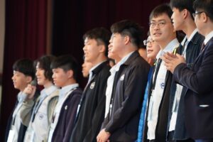 ①那賀高校校長挨拶 ②台湾引率先生挨拶 ③記念品贈呈 ④那賀高校生徒会長挨拶